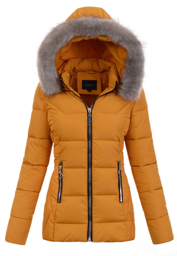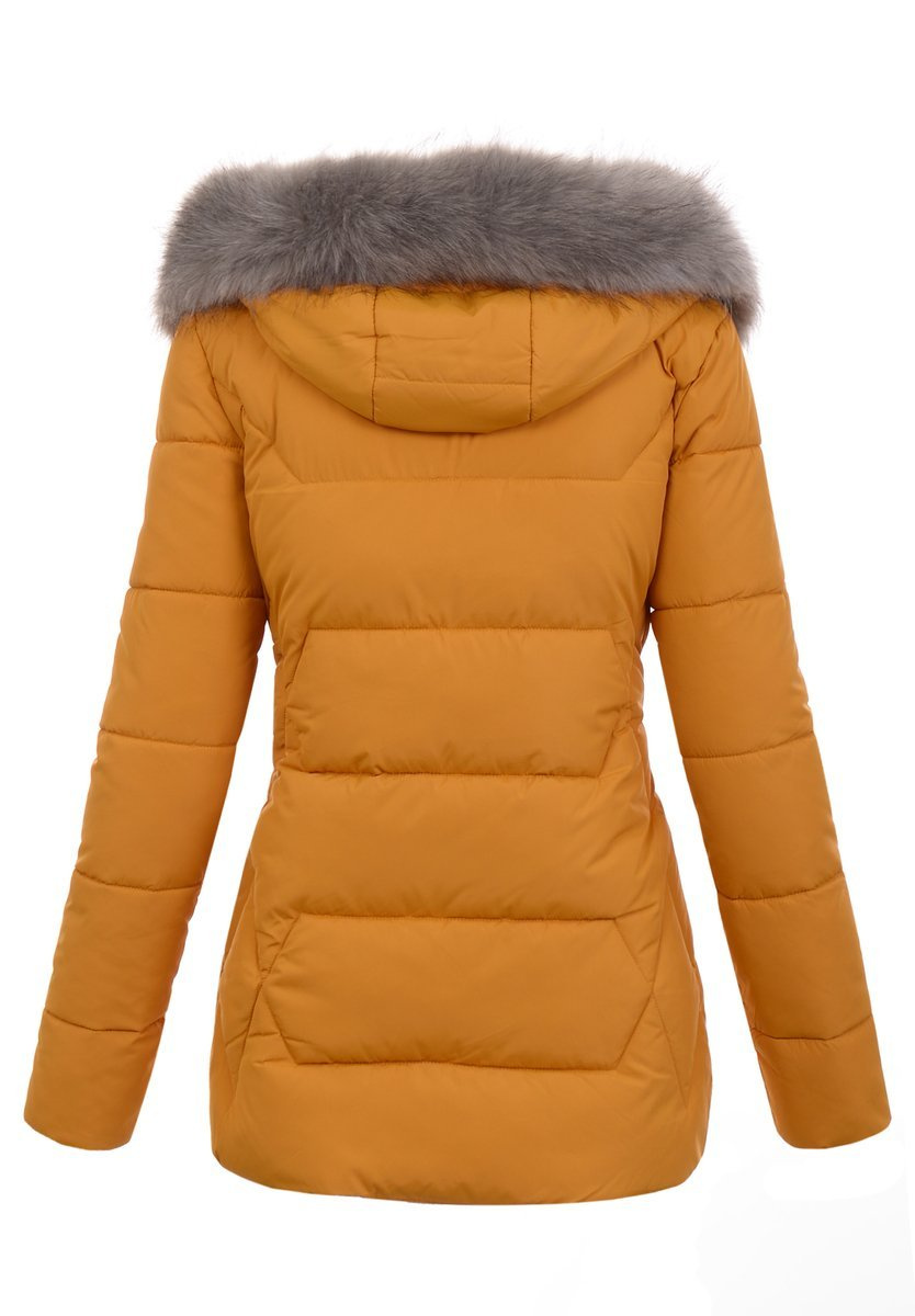 Rewelacyjna kurtka damska w kolorze żółtym. Wypełnienie kurtki zapewnia ciepło w mroźne dni. Rękawy kurtki są ocieplane, wykończone podszewką. Kurtka zasuwana jest na suwak. Kurtka posiada z przodu dwie kieszenie zasuwane na suwaki. Odpinany kaptur z odpinanym futerkiem zapewnia ciepło w wietrzne zimowe dni.  Kurtka wykonana jest z materiałów najwyższej jakości. Kurtka ocieplona wysokiej jakości wypełnieniem syntetycznym które zapewnia doskonałą termoizolację oraz wysoki komfort użytkowania.